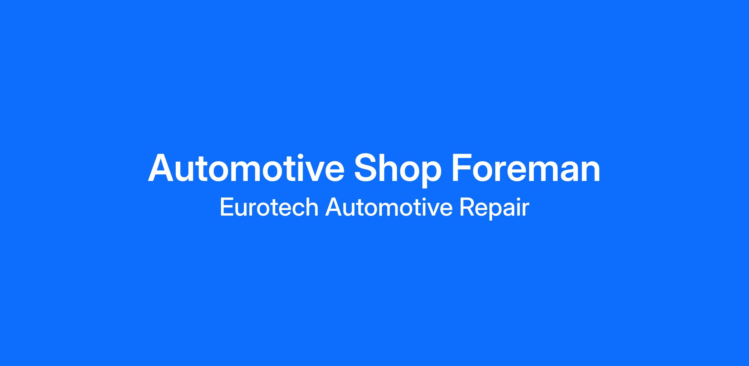At Eurotech Automotive Repair, we pride ourselves on providing top-notch service to our customers and creating a positive work environment for our employees. We offer competitive pay, ongoing training opportunities, and a supportive team atmosphere. Joining our team as a Automotive Shop Foreman gives you the chance to showcase your skills, grow your career, and make a difference in the lives of our customers.